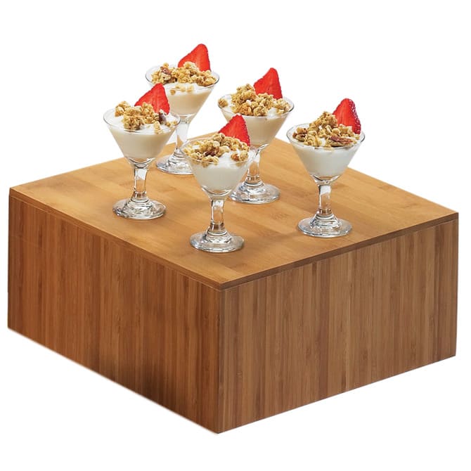 This square cube riser from Cal‐Mil is 12" on each side and is 6" high. It is perfect for displaying your culinary creations and will help keep tabletops organized and clutter free. This riser is constructed of bamboo and is great for hotels, restaurants or catered events.