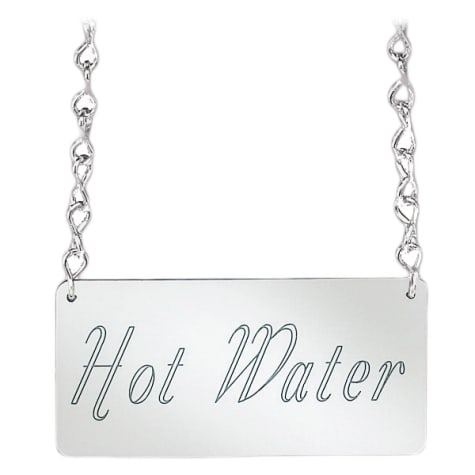 This Cal‐Mil "HOT WATER" sign and chain is designed to be used with coffee urns.