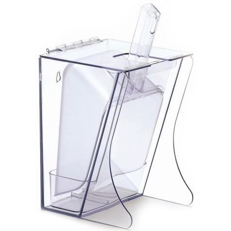 This Cal‐Mil Freestanding Ice Scoop Holder is Clear and Holds a 64 ounce scoop.