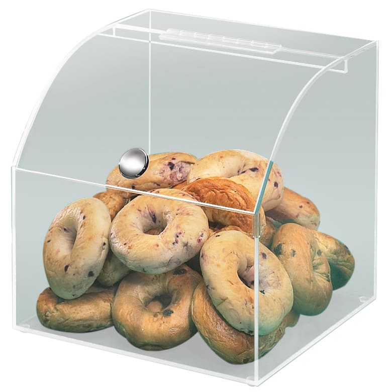 This Cal‐Mil Bread Bin has a curved top opening and is made from clear acrylic.