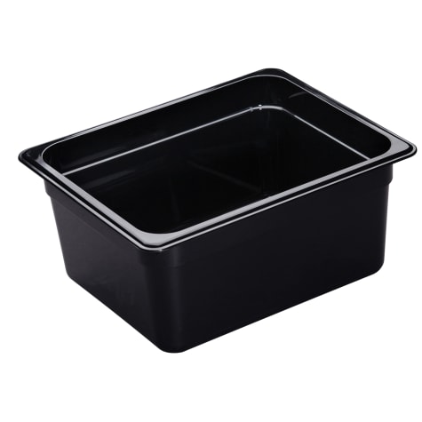 For going from prep to cooler to oven to steam table with just one pan, use this black, 6" high half size H‐Pan™ made of durable, heat‐resistant plastic. This high heat food pan withstands temperatures from ‐40°F all the way up to 375°F, making it perfect for flash freezing, cooking and reheating; you can use it with steam tables, chafing dishes and more. The smooth, non‐stick interior makes cleaning easy, and also helps the pan stack neatly without sticking.