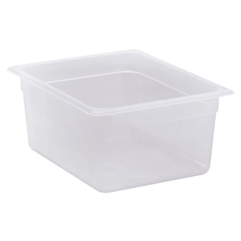 For a more economical choice for prep tables, food bars and vending carts, use this translucent, 6" high half size food pan made of durable polypropylene. The translucent material allows for content visibility, and this pan withstands temperatures from ‐40°F to 160°F, making it good for both warm and cold food. The smooth, non‐stick interior makes cleaning easy, and also helps the pan stack neatly without sticking.