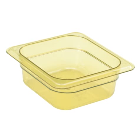 For going from prep to cooler to oven to steam table with just one pan, use this amber, 2‐1/2" high 1/6 size H‐Pan™ made of durable, heat‐resistant plastic. This high heat food pan withstands temperatures from ‐40°F all the way up to 375°F, making it perfect for flash freezing, cooking and reheating; you can use it with steam tables, chafing dishes and more. The smooth, non‐stick interior makes cleaning easy, and also helps the pan stack neatly without sticking.