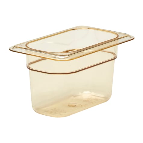 For going from prep to cooler to oven to steam table with just one pan, use this amber, 4" high 1/9 size H‐Pan™ made of durable, heat‐resistant plastic. This high heat food pan withstands temperatures from ‐40°F all the way up to 375°F, making it perfect for flash freezing, cooking and reheating; you can use it with steam tables, chafing dishes and more. The smooth, non‐stick interior makes cleaning easy, and also helps the pan stack neatly without sticking.