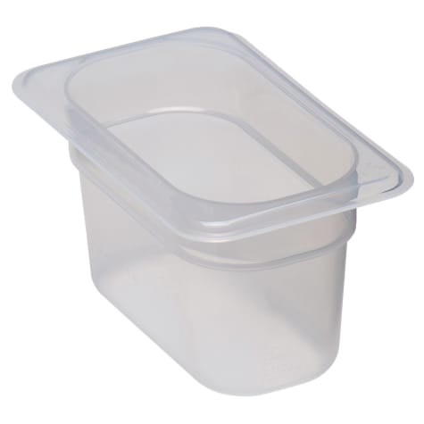 For a more economical choice for prep tables, food bars and vending carts, use this translucent, 4" high 1/9 size food pan made of durable polypropylene. The translucent material allows for content visibility, and this pan withstands temperatures from ‐40°F to 160°F, making it good for both warm and cold food. The smooth, non‐stick interior makes cleaning easy, and also helps the pan stack neatly without sticking.