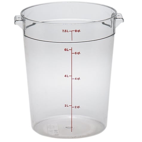 This Cambro clear 8 quart round container made of virtually unbreakable, stain‐resistant Camwear polycarbonate. It has easy‐to‐read graduations on the outside that let you take inventory at a glance, and you can pair this container up with the matching size of snap‐on lid to keep things fresh for even longer. This container withstands temperatures from ‐40°F to 210°F, making it good for both hot and cold food.