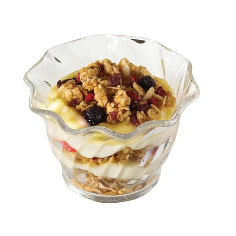 This small, clear 5 ounce swirl‐pattern bowl is made of break‐resistant plastic and is just the right size to sit on a plate next to an entree or stack on a buffet station. You can use it for cereal or fruit at breakfast, side dishes or desserts at dinner, or anything in between.