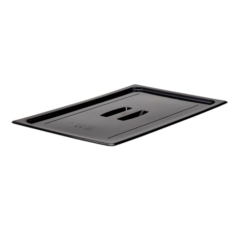This black Cambro Camwear full size polycarbonate handled lid is perfect for covering full size food pans in any commercial kitchen. With its virtually‐unbreakable polycarbonate design, it's built to withstand temperatures from ‐40 to 210 degrees Fahrenheit. The handle cover conveniently stacks for storage and transport. It is NSF Listed and dishwasher safe.