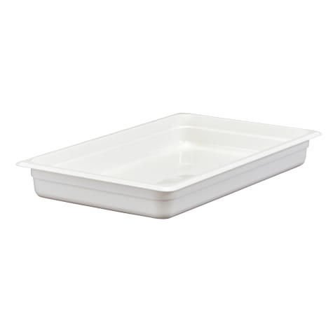 For serving, transporting and storing food all in one unit, use this white, 2‐1/2" high full size food pan made of virtually unbreakable Camwear polycarbonate. This pan will not crack, bend or dent, and it withstands temperatures from ‐40°F to 210°F, making it good for both hot and cold food. The smooth, non‐stick interior makes cleaning easy, and also helps the pan stack neatly without sticking. This Cambro full size food pan can be used with the 10CWC flat cover, the 10CWCH cover with handle, and the 10CWCHN notched cover with handle.