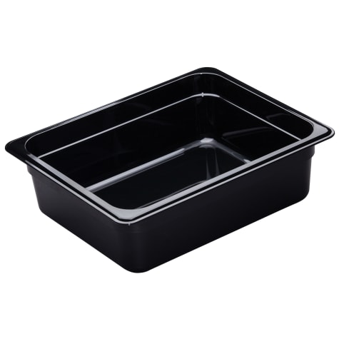 For going from prep to cooler to oven to steam table with just one pan, use this black, 4" high half size H‐Pan™ made of durable, heat‐resistant plastic. This high heat food pan withstands temperatures from ‐40°F all the way up to 375°F, making it perfect for flash freezing, cooking and reheating; you can use it with steam tables, chafing dishes and more. The smooth, non‐stick interior makes cleaning easy, and also helps the pan stack neatly without sticking.