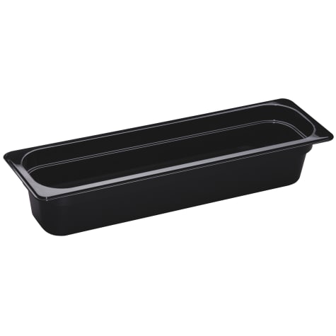 For going from prep to cooler to oven to steam table with just one pan, use this black, 4" high, long half size H‐Pan™ made of durable, heat‐resistant plastic. This high heat food pan withstands temperatures from ‐40°F all the way up to 375°F, making it perfect for flash freezing, cooking and reheating; you can use it with steam tables, chafing dishes and more. The smooth, non‐stick interior makes cleaning easy, and also helps the pan stack neatly without sticking.