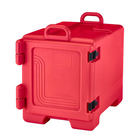For transporting and serving large amounts of food in places without a proper kitchen, use this hot red 36 quart front-loading Ultra Pan Carriers. You can fit one 8" deep full size food pan into this carrier, or you can load multiple 2-1/2" deep, 4" deep or 6" deep pans instead. The tough polyethylene construction and thick foam insulation make it good for both hot and cold food, and the molded-in handles make it easy to move around. This Ultra Pan Carriers also stacks easily for more efficient transport and storage.