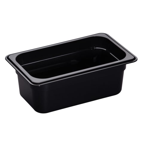 For going from prep to cooler to oven to steam table with just one pan, use this black, 4" high 1/4 size H‐Pan™ made of durable, heat‐resistant plastic. This high heat food pan withstands temperatures from ‐40°F all the way up to 375°F, making it perfect for flash freezing, cooking and reheating; you can use it with steam tables, chafing dishes and more. The smooth, non‐stick interior makes cleaning easy, and also helps the pan stack neatly without sticking.