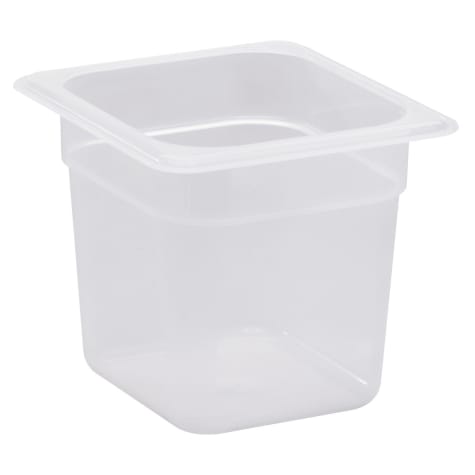 For a more economical choice for prep tables, food bars and vending carts, use this translucent, 6" high 1/6 size food pan made of durable polypropylene. The translucent material allows for content visibility, and this pan withstands temperatures from ‐40°F to 160°F, making it good for both warm and cold food. The smooth, non‐stick interior makes cleaning easy, and also helps the pan stack neatly without sticking.