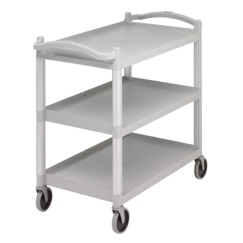 This 3-shelf utility cart is made of durable, economical polypropylene and holds up to 400 lbs., with one full size dish rack or two standard bus boxes fitting side by side on each shelf. The aluminum uprights ensure stability and the 5" swivel casters are quiet and non-marking. Optional accessories available are a single shelf panel set, a removable 8 gallon trash container and 2.5 gallon silverware holder. Shelf panels must be added at time of assembly.