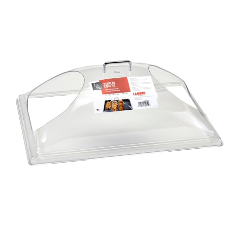 Use this clear, dome‐shaped display cover in your bakery to display your cakes and pies and keep them fresh. This cover is made of virtually unbreakable Camwear polycarbonate and it fits 12" x 20" trays and has a hole on each end for easy access to the tray's contents. It comes with a contemporary chrome handle on top.