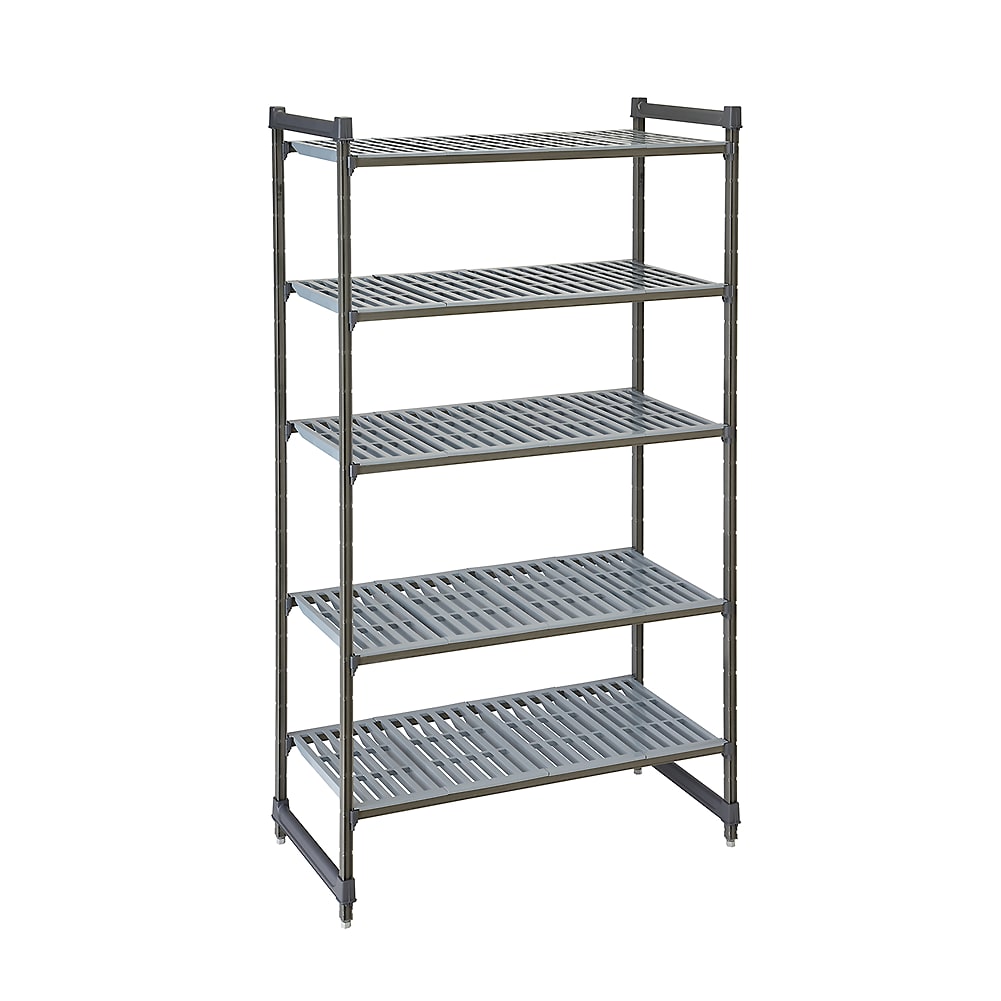 This Camshelving® Basics Plus Vented 5-Shelf Stationary Starter Unit is a versatile shelving solution designed for kitchens, coolers, walk-ins, or dry storage. It features smooth composite plastic shelves that are easy to clean and dishwasher-safe. With a lifetime guarantee against corrosion and rust, this NSF-listed unit provides reliable storage for various supplies.