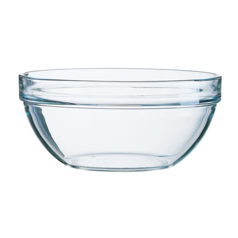 Fully tempered clear glass stackable bowls. Highly durable and functional ‐ equally at home in the front of the house or in kitchen prep. This collection of right sized bowls stack easily and securely.