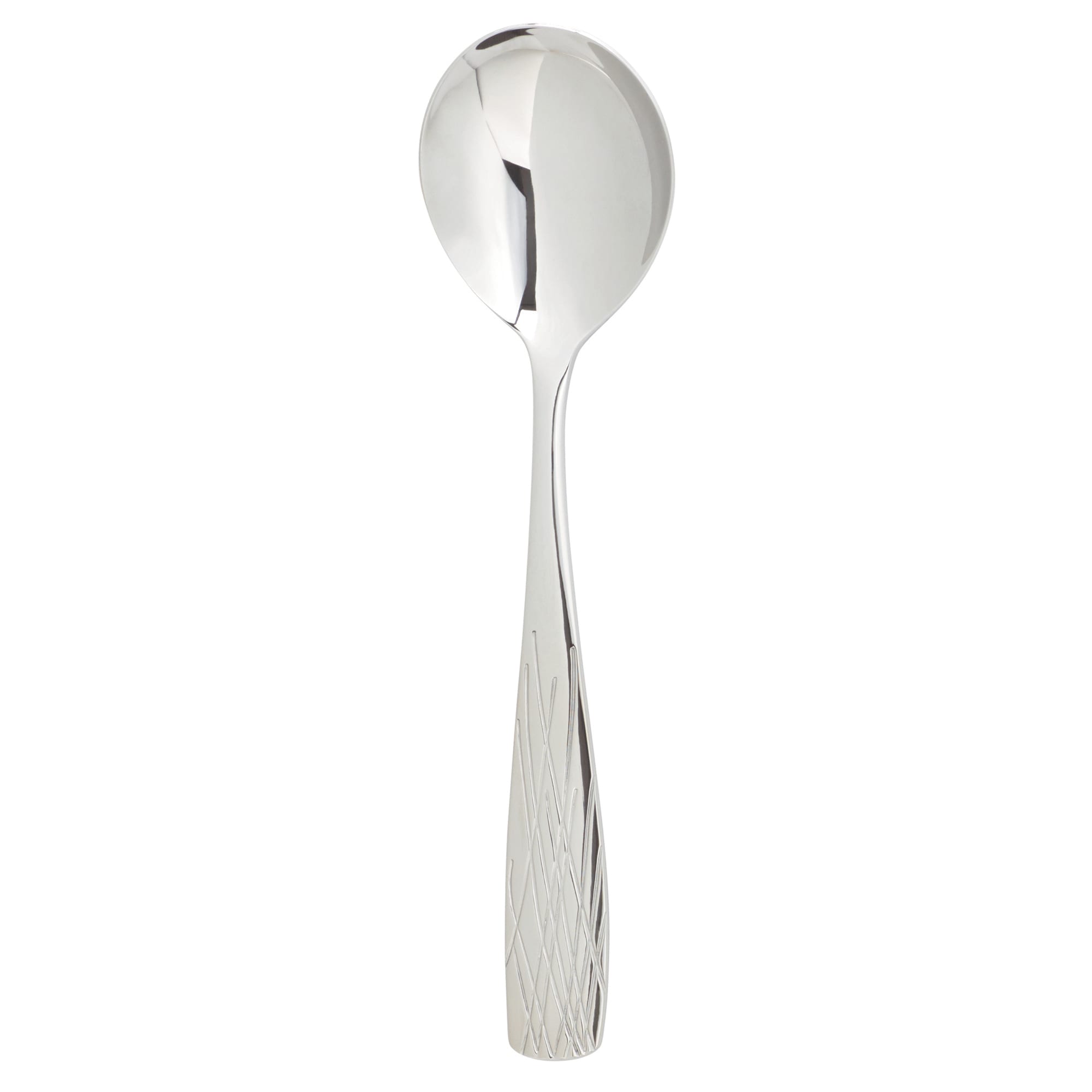 This Lakeview 6‐7/8" soup spoon features beautiful textured handles with a cross‐hatch pattern hide fingerprints for an organic chic presentation.