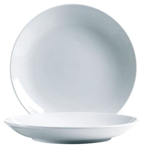 This 12" deep plate features the unique shapes and concentric circles of Rondo Dinnerware that draw your eye to the center where food is the focus. A gentle and updated coupe shape adds versatility to the dining experience.