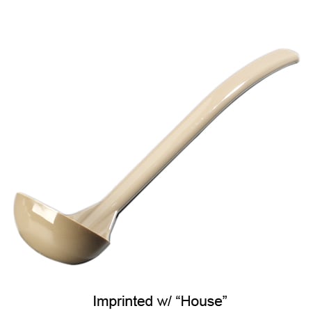 This beige serving ladle from Carlisle® has a capacity of 1 ounce and is made of one-piece polycarbonate material. It features an oval shaped bowl that allows pouring of dressings from both sides. This ladle is 9.5" long.