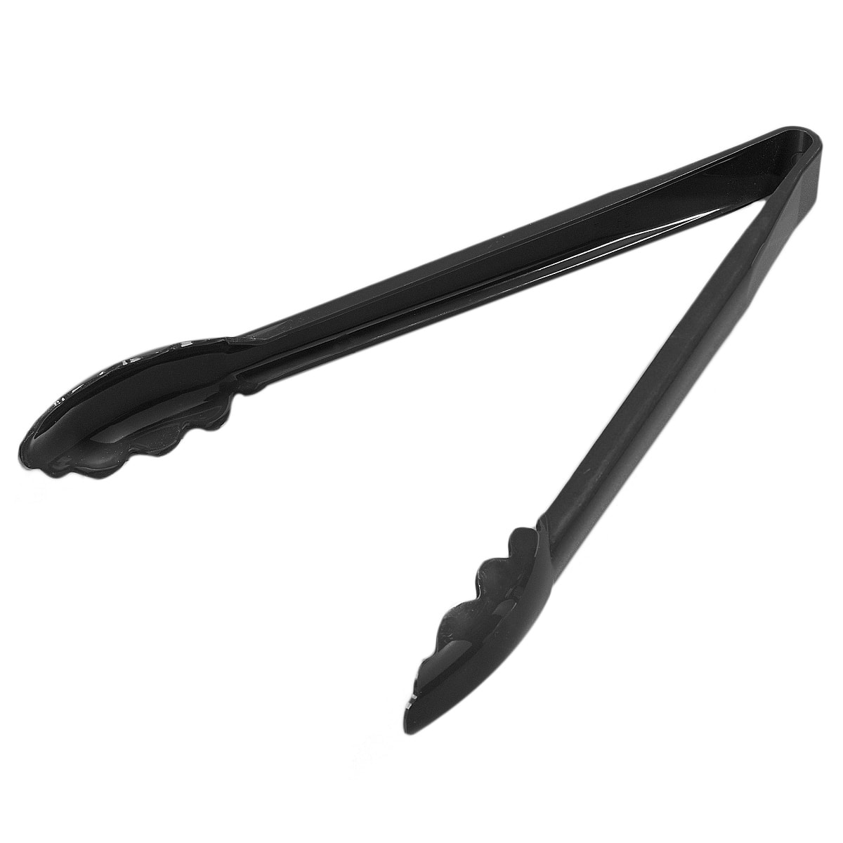 This black Carly® utility tong has a scalloped design that is made of a break‐resistant plastic that does not transfer heat so the tong stays cool to the touch at all times.