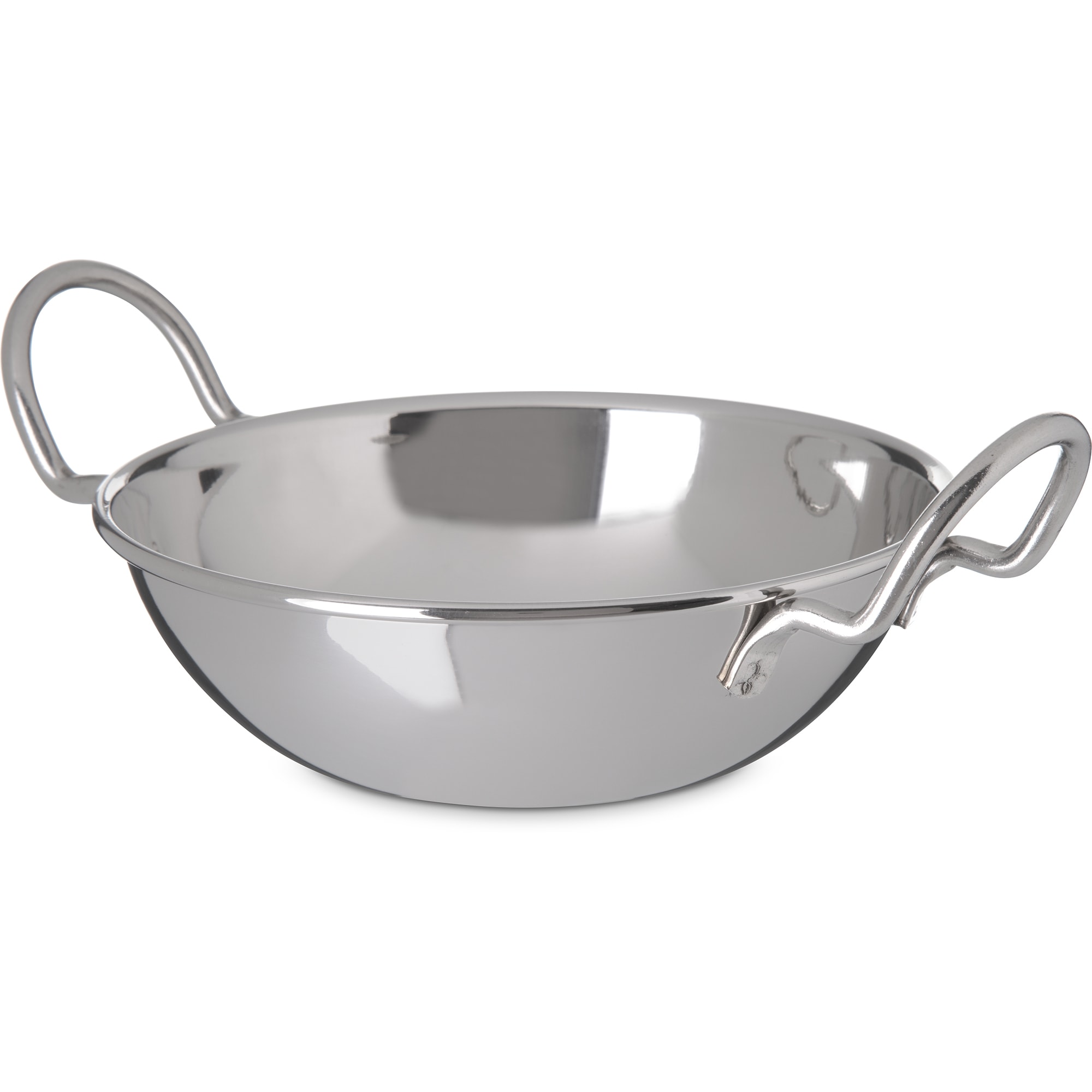 This 20 ounce stainless steel balti dish is great for food preparation and presentation as well as deli displays. The attached handles make this bowl easy to lift and transport.