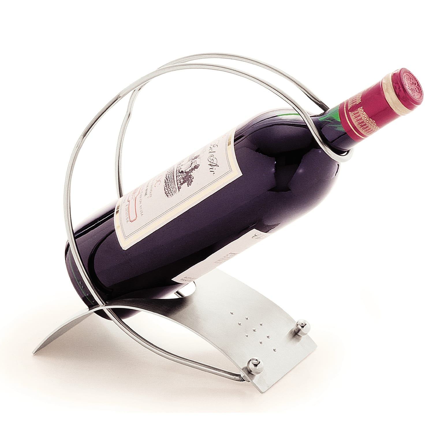 This Carlisle red wine holder is made of durable 18‐8 stainless steel with a beautiful satin finish that never requires polishing. Two rings orbit above the base to create an easy carry handle and the bottle snaps into the handle for pouring.