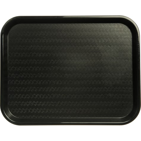 This black cafe tray features a skid resistant surface to help minimize spillage and drying and stacking lugs that help decrease drying times. This lightweight polypropylene construction is easy to clean and NSF approved.