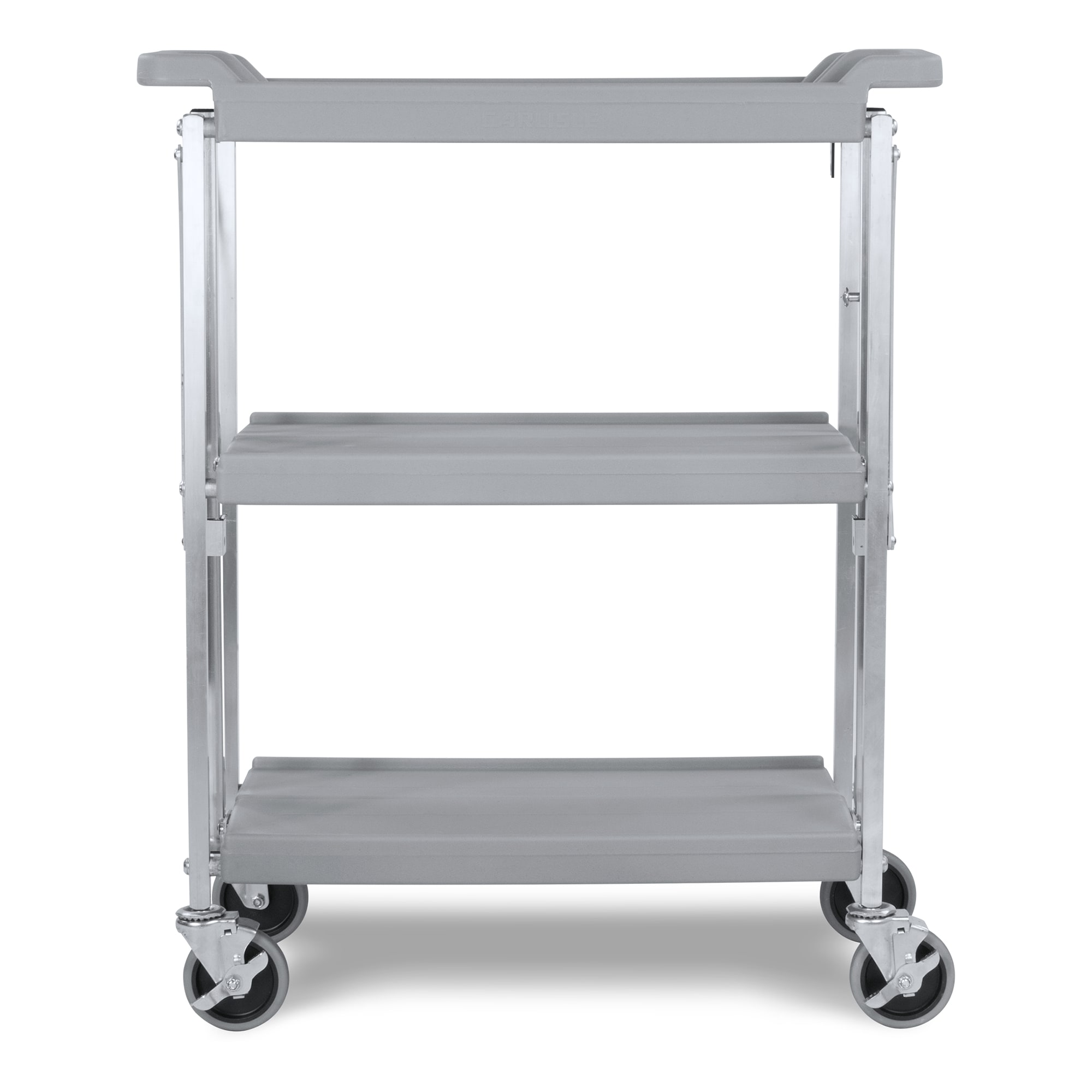 This Carlisle® Fold 'No Go® Gray Cart is ideal for a wide variety of uses. It folds and unfolds in a quick, easy motion. It is made from durable polyethylene and features heavy‐duty 4" swivel casters.
