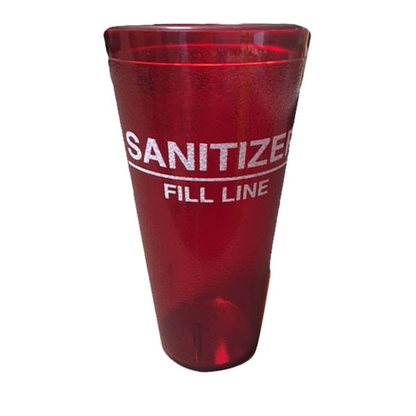 This red 24 ounce sanitizer cup from Carlisle® has a 24 ounce capacity and features a tapered shape and integrated stacking lugs that allows the cups to nest for space-efficient storage without jamming.