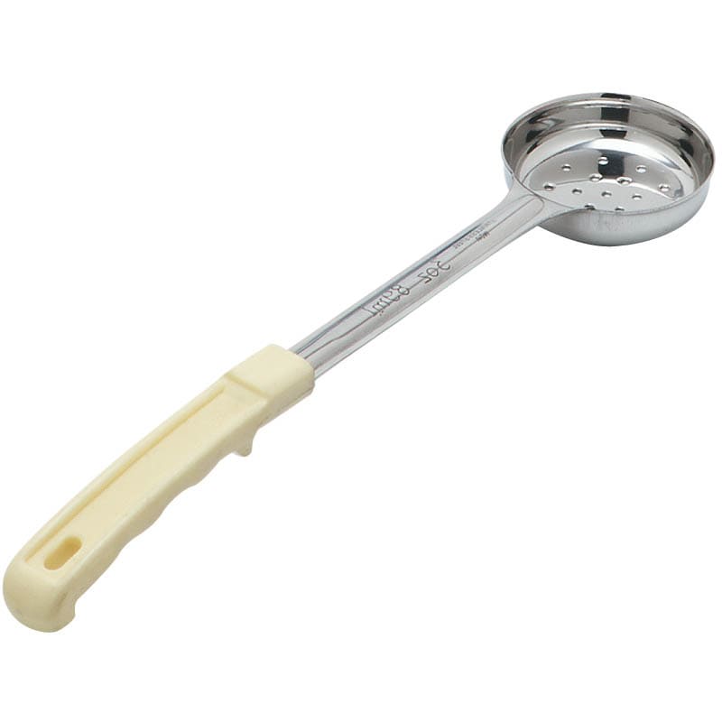 This 3 ounce perforated Portion Control Spoon from Carlisle® has a beige handle for quick size recognition. It is perfect for use in any kitchen and gives you accurate measurements every time.