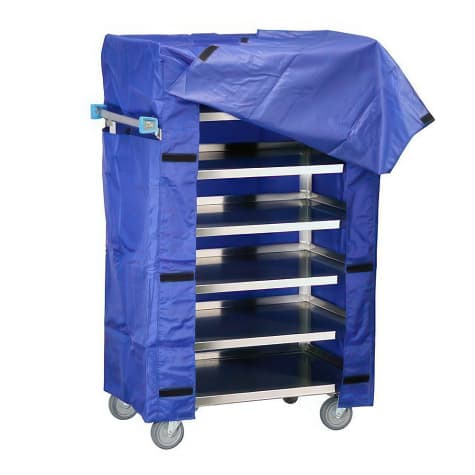 Lakeside delivery carts are perfect for room service. Featuring an open design, it comes with 6 shelves and a cover. The all‐welded construction provides the durability you are looking for and the stainless steel construction makes it easy to clean. The standard model includes a washable, fire‐retardant, blue nylon cover with velcro closures to conceal trays. Benefit from the industry's fastest lead times from Lakeside's USA‐based factory.