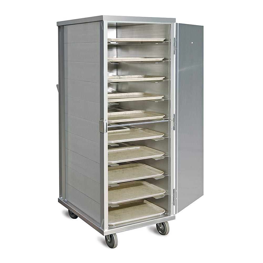 This 20-capacity tray delivery cart features sturdy aluminum with a solid bottom, rolled bumper edge and reinforced channels. The sturdy glides hold trays and pans securely in place while stationary or in transit.
