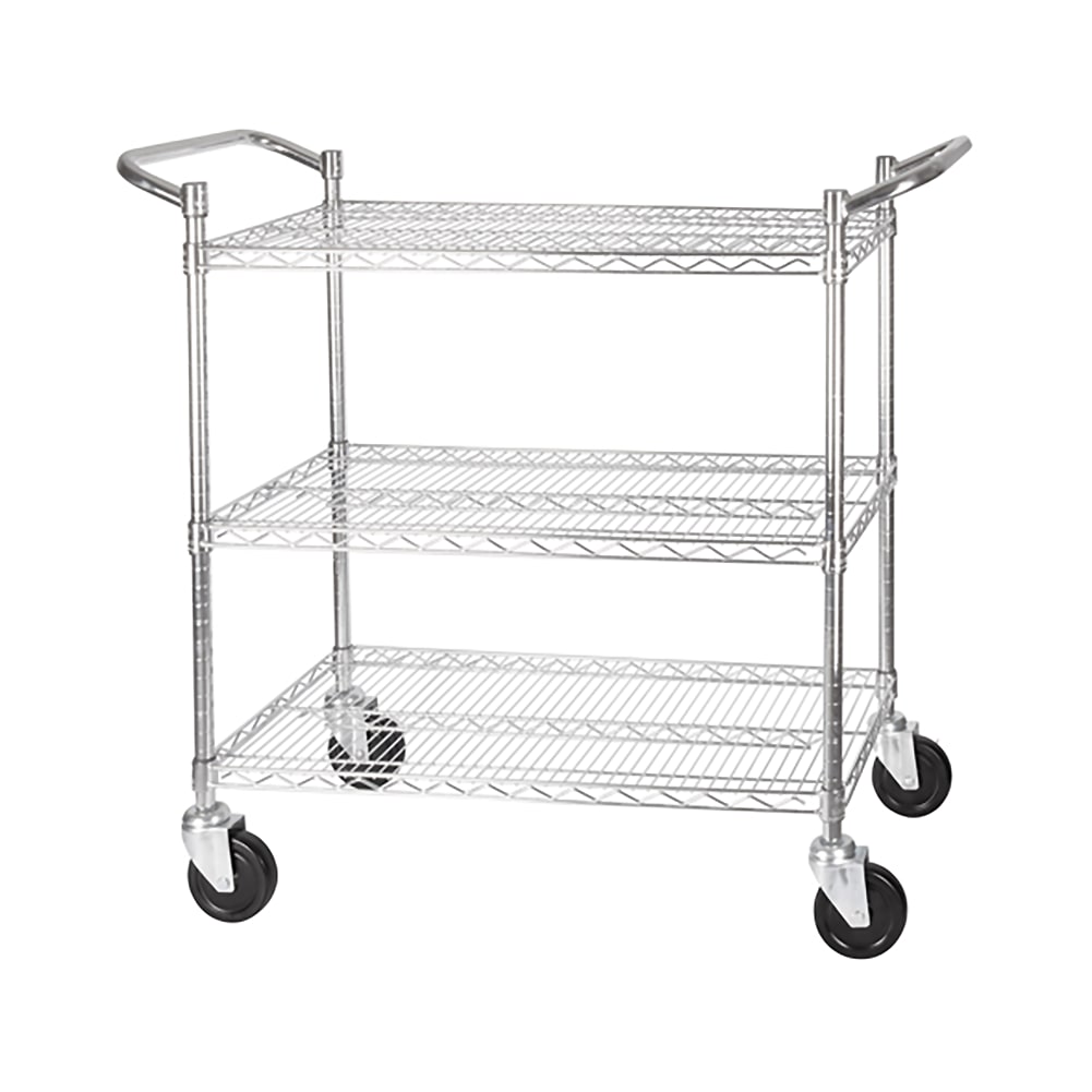 This 3-tier wire shelving cart from Winco is designed for heavy-duty use in commercial environments. With a load capacity of up to 800 pounds, this exceptionally durable cart is ideal for restaurants, hotels, and commercial foodservice kitchens. It features adjustable height shelves and double handles for secure grip during transportation. The smooth-rolling casters include brakes for easy maneuvering.