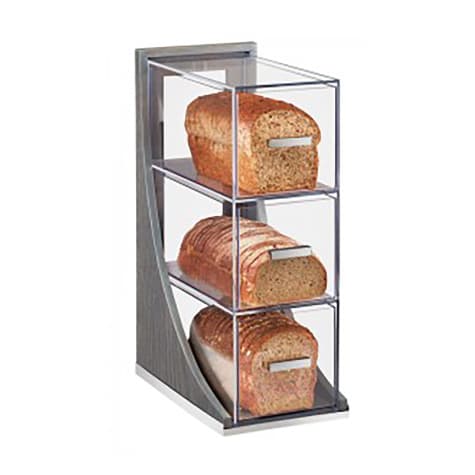 The Cal-Mil 3815-83 Ashwood Bread Case features a gray-washed oak frame and clear acrylic body, offering a modern yet rustic display for baked goods. With three easy pull-out drawers, it is perfect for showcasing fresh bread and pastries in bakeries and breakfast buffets.