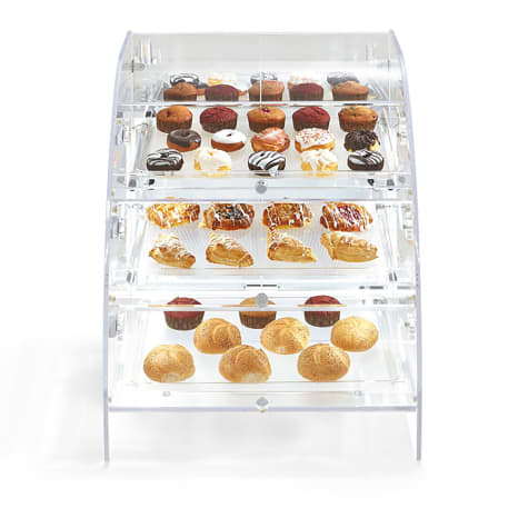 This Vollrath pastry display is made of crystal clear acrylic to show off your delicious pastries. The soft down doors provide easy one‐handed service and it has a storage compartment for boxes, bags, and tongs.