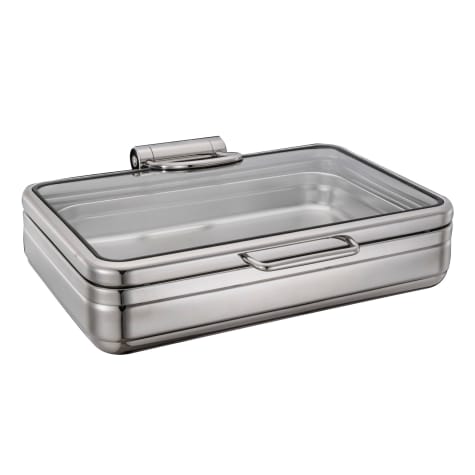 This Magnifico Rectangular Induction Chafer from Bon Chef features 18/ 8 stainless steel construction with a glass lid so guests can easily view the contents without opening.