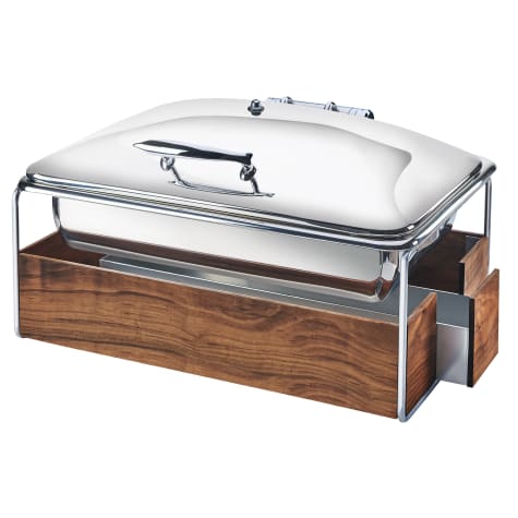 This Cal‐Mil Mid‐Century chafer has a vintage look that guests will love while providing the features of a modern chafer. It features warm walnut wood and has a chrome finish that fits in with any display.