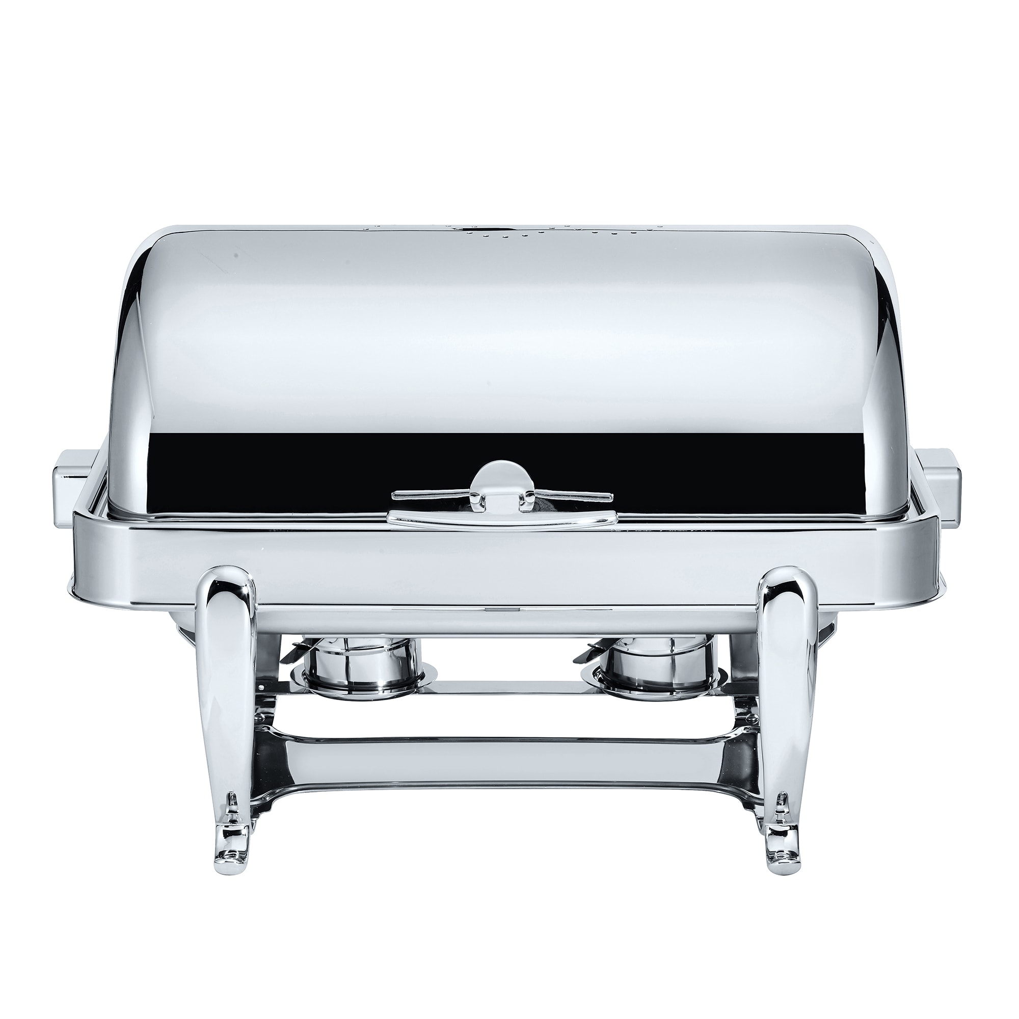 With superior styling in 18/10 stainless steel, this chafer from Worthy, Noble and Kent is loaded with features and promises to have a long service life. It features a 180 degree roll top vented cover, enhanced by a water channel system, redirecting condensation to the water pan instead of the food. A continuous hinge universal braking system allows for the lid to be placed in any open, stationary position.