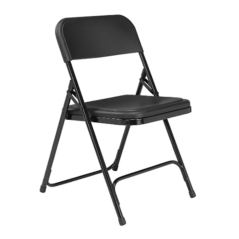 The 800 Series black folding chair from National Public Seating offers the perfect solution for both indoor and outdoor seating events such as meetings, graduations and receptions. This lightweight institutional-grade chair was made to provide you with the strengths of metal and all the benefits of plastic. The powder-coated 18-gauge tubular steel frame features two double-riveted U-braces - one in front and one in back - to securely support the double-hinged legs. The large seat and backrest are made of comfortable contoured color-impregnated plastic to prevent fading and rusting. Color-coordinated V-tip stability plugs provide added reinforcement at the frame's junction and matching replaceable glides prevent floor damage. These stack horizontally up to 36 chairs high. The 800 Series meets MAS Certified Green and ANSI/BIFMA standards.