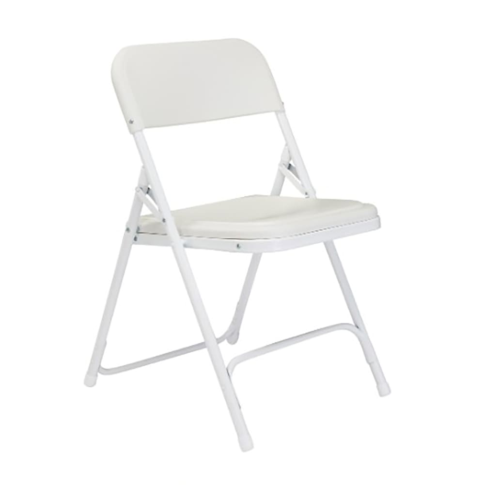 The 800 Series bright white folding chair from National Public Seating offers the perfect solution for both indoor and outdoor seating events such as meetings, graduations and receptions. This lightweight institutional-grade chair was made to provide you with the strengths of metal and all the benefits of plastic. The powder-coated 18-gauge tubular steel frame features two double-riveted U-braces - one in front and one in back - to securely support the double-hinged legs. The large seat and backrest are made of comfortable contoured color-impregnated plastic to prevent fading and rusting. Color-coordinated V-tip stability plugs provide added reinforcement at the frame's junction and matching replaceable glides prevent floor damage. These stack horizontally up to 36 chairs high. The 800 Series meets MAS Certified Green and ANSI/BIFMA standards.