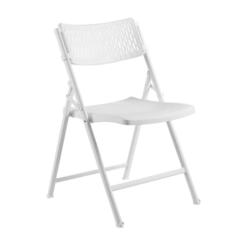 This white folding chair features distinct AirFlex design, using air technology and contours to each individual making for the perfect balance of comfort and strength. Built on an 18 gauge steel frame with 11 gauge seat braces along with ultra-durable industrial grade 3.8mm polypropylene seat and back allows for a 1000 lbs. weight capacity making the Airflex virtually indestructible. Oversized 18 inch seat pan and ventilated design provides extreme comfort for all day use. It’s the ideal chair for any indoor or outdoor event. Glides & leg plugs allow for stacking & nesting.