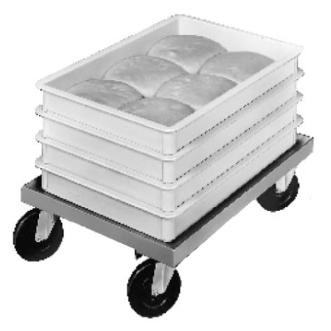 This Channel Dough Box Dolly features aluminum construction and includes bolted 5" all-swivel casters. It comes in a 17.75" x 25.25" size.