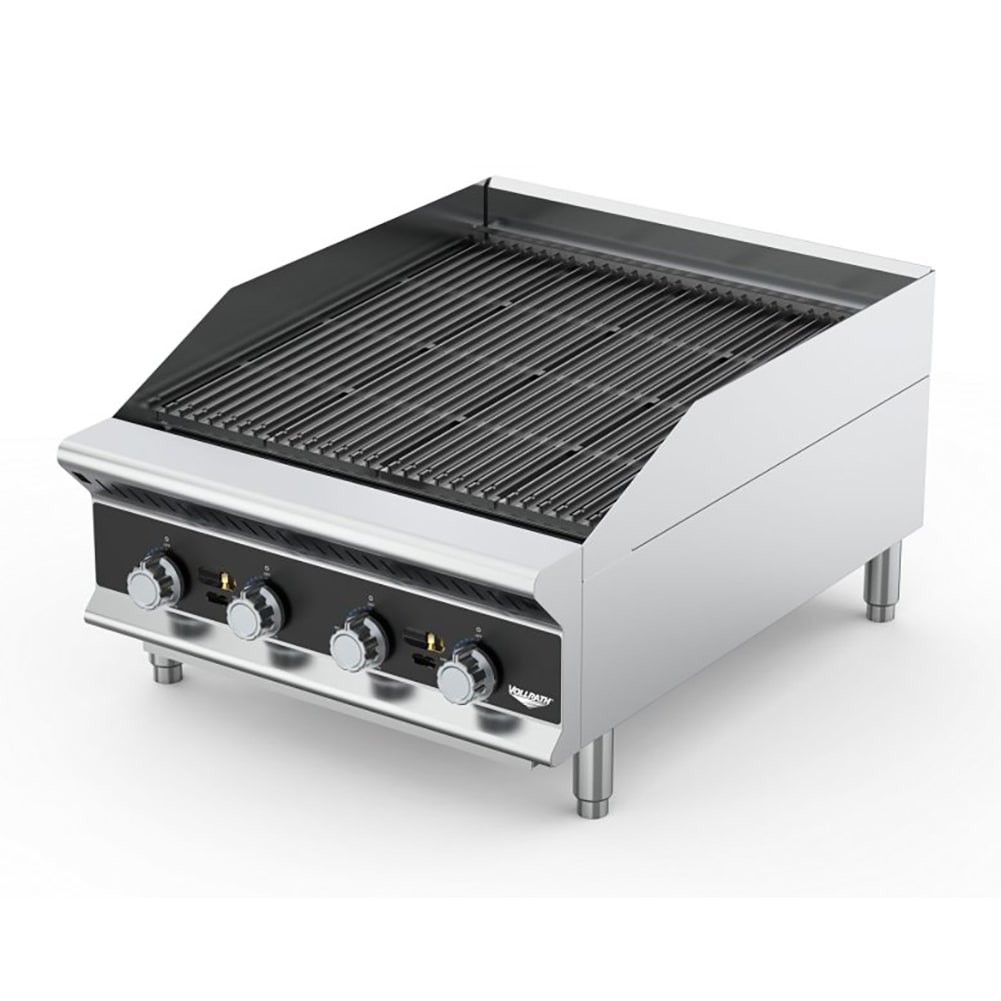 This 24 x 32-3/8 x 16-3/8" Vollrath® Heavy-Duty Gas Charbroiler is sturdy. Versatile grill plates feature narrower surfaces on one side with integral channels designed to dispense excess fat while reducing smoke and flames. The flip side features flatter, wider grill surfaces, ideal for fish and other delicate foods. Adaptor bars enable grill plates to be positioned away from heat for slower cooking and minimal flareups.