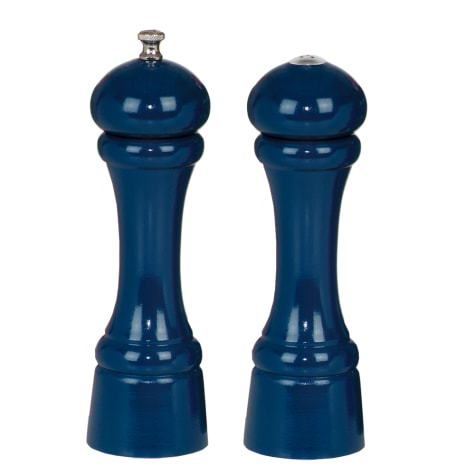 This 8 pepper mill and salt shaker set from the Autumn Hues collection features a deep cobalt blue finish and a commercial‐quality stainless steel grinding mechanism. Both pieces are turned from Maine‐grown northeastern hard maple.