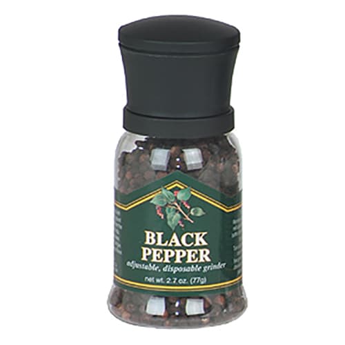 This disposable black pepper grinder from Chef Specialties features a recyclable bottle and an adjustable grinder top. It is filled in the USA with American Spice Trade Associated Grade-1 Malabar Black Peppercorns. A perfect spice grinder to go!
