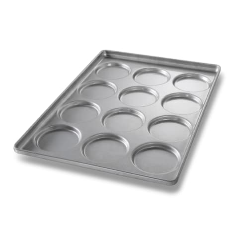 This Chicago Metallic Pan has a 12‐cavity design and can be used to make hamburger buns, muffin tops, or cookies. It has a glazed finish. Made for commercial ovens, does not fit most residential ovens.