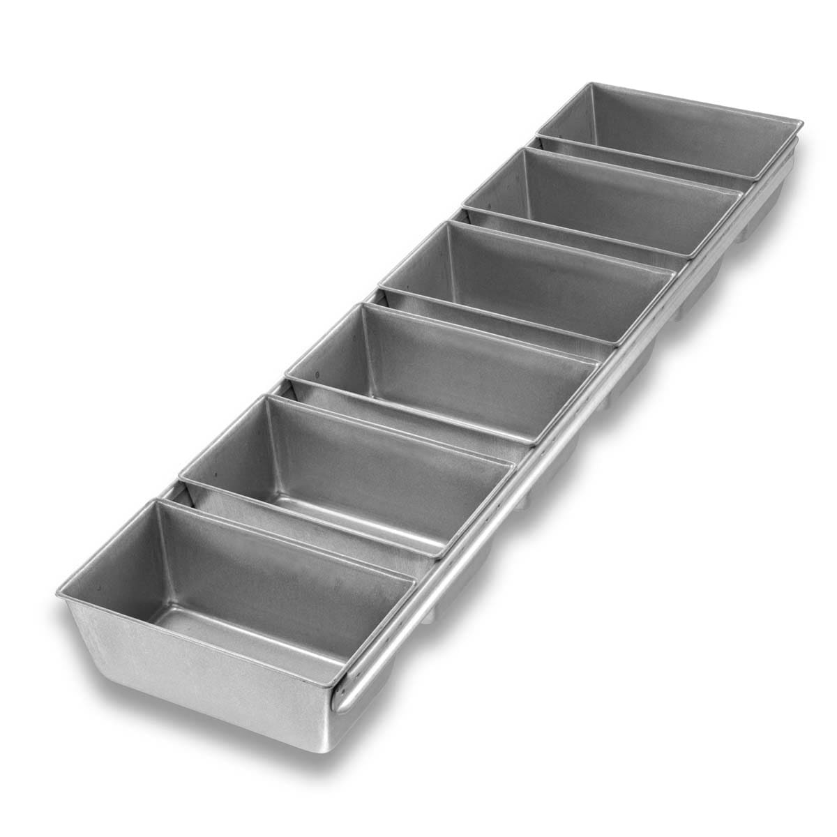 This Chicago Metallic 6‐Strap Open Top Bread Pan allows you to bake up to six loaves of bread at once. It is made from aluminized steel and has a seamless design. Its glazed finish has non‐stick properties.