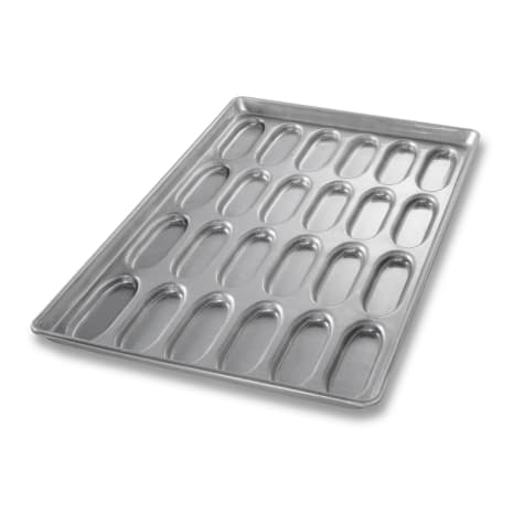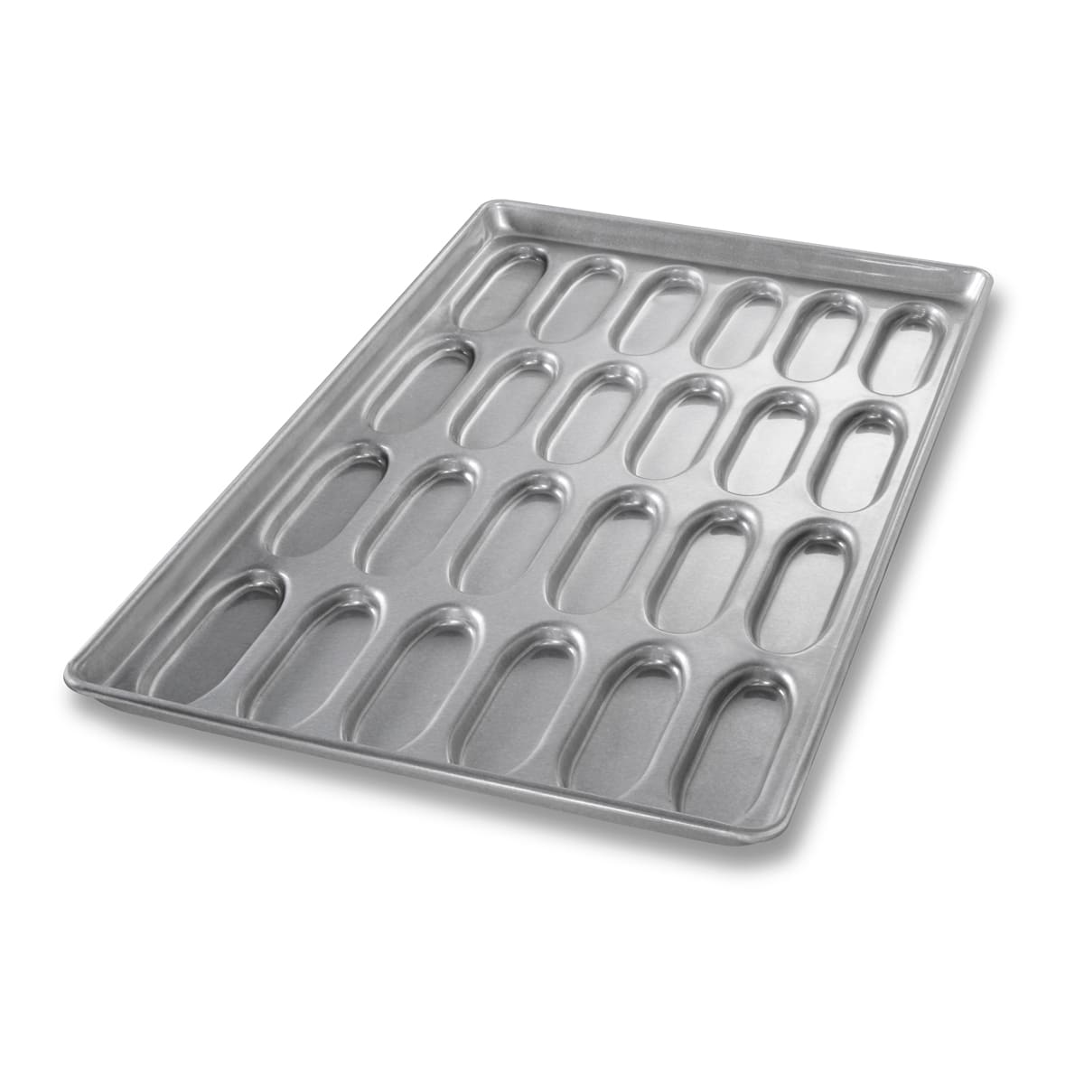 This Chicago Metallic Pan has 24‐cavities and can be used to bake hot dog buns. It is made from aluminized steel and has a glazed finish for non‐stick properties. Made for commercial ovens, does not fit most residential ovens.